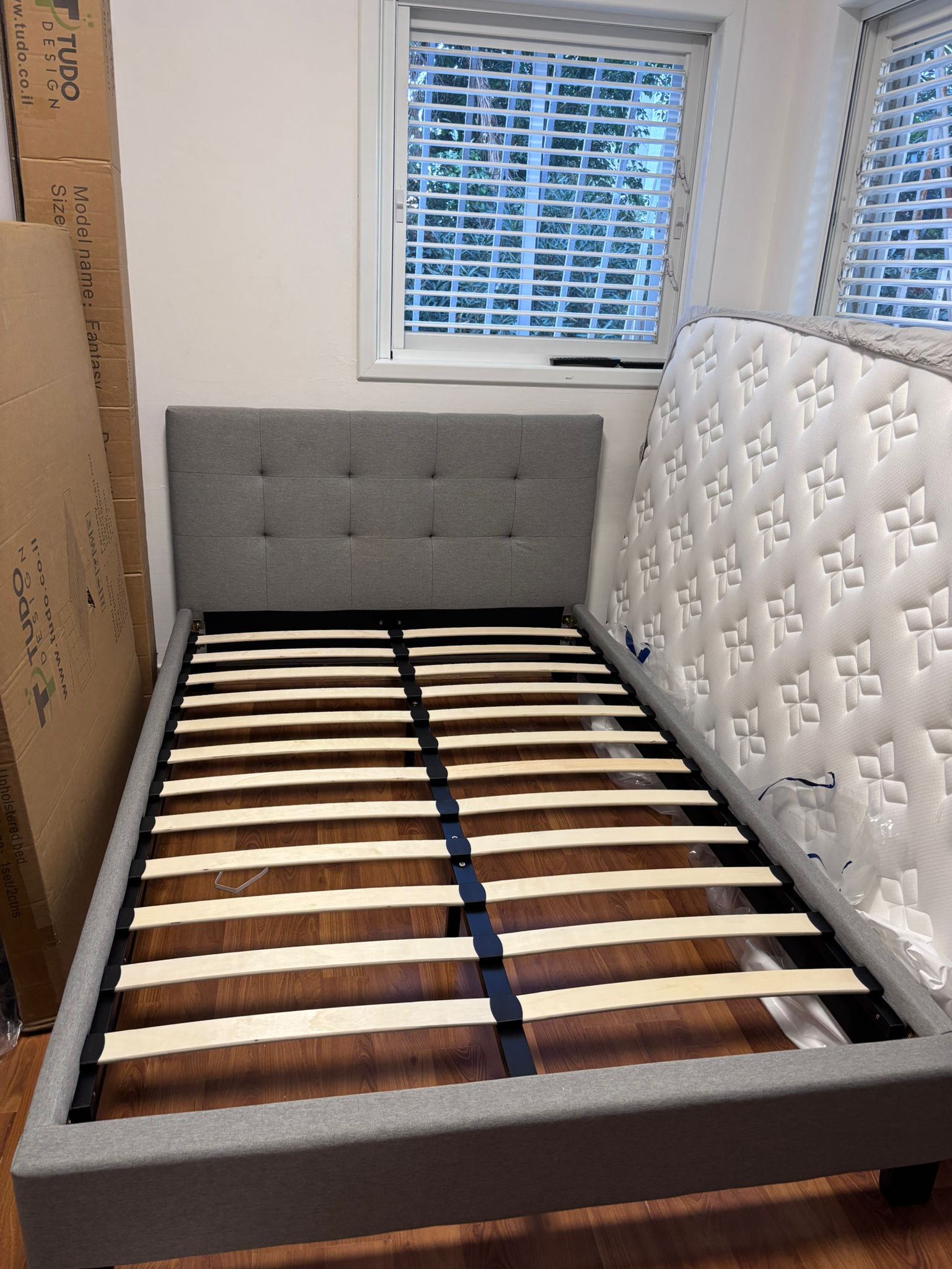 בסיס המיטה כולל שלבי עץ (קורות קפיציות) לתמיכה אופטימלית במזרן.